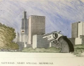 The “Saturday Night Special” monument was designed in 1973 for Grant Park in Chicago. I designed a 45-caliber handgun pointing down one of the streets that ended at the park. This enormous gun would allow visitors to climb up its handle to a platform. A guests would be inside the gun with a huge firing pin above, a rotating cylinder before them and barrel beyond to see the street in the distance. A visitor could cock the firing pin, hear the cylinder rotate, then squeeze the trigger, while puff of air and wisp of smoke emerged from the barrel. They could listen to the pop of the gun firing. The sound would not go beyond the visitor’s platform.