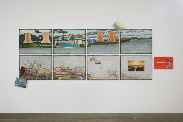 TMI Swatara, 2020, Oil stick with post cards, a print of Lloyd Miffin’s painting of the Suquehanna River in the. 1870’ attached, and two Photoshopped images, 8 drawings 22” x 30” ( 55.88 x 776.2 cm), mounted on Aluminum plate, with red title block with eel and quote from William Burroughs in the “Naked Lunch”